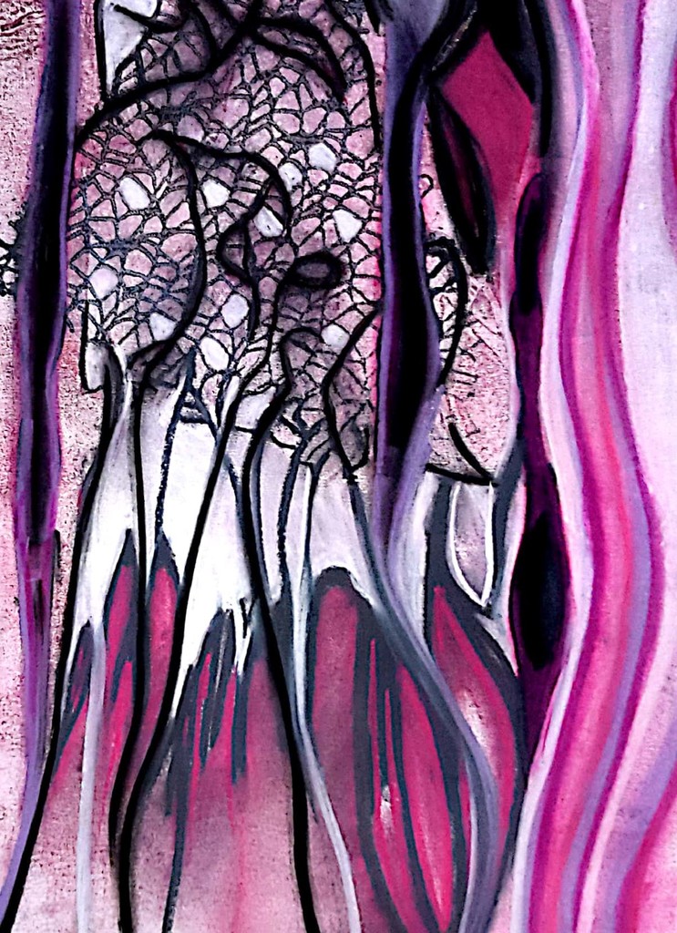Monoprint in oorspronkelijke vorm van een knotwilg in olieverf en uitgewerkt met pastelkrijt.