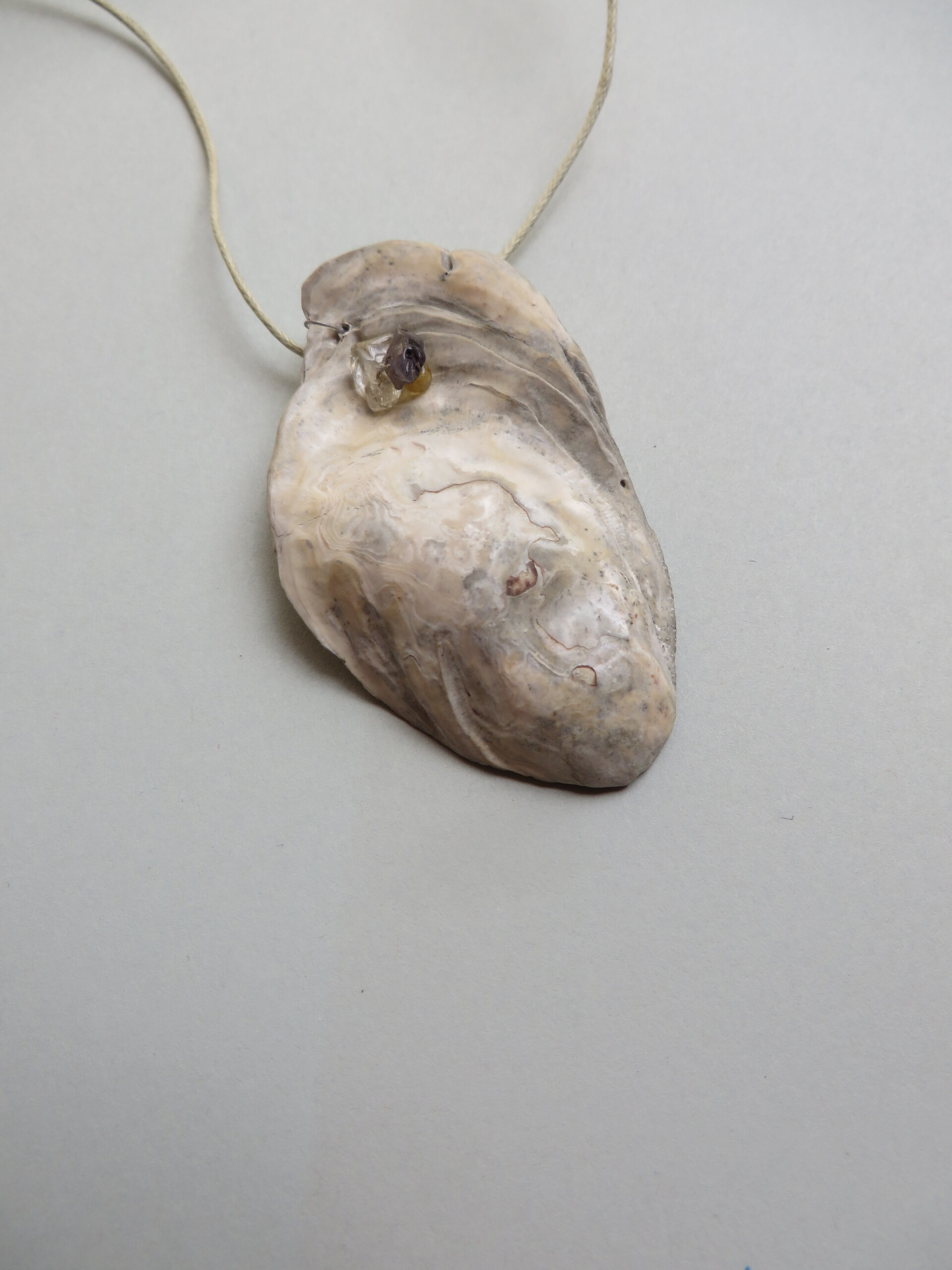 Hanger bestaande uit een schelp en kristallen compositie (inclusief koordketting).