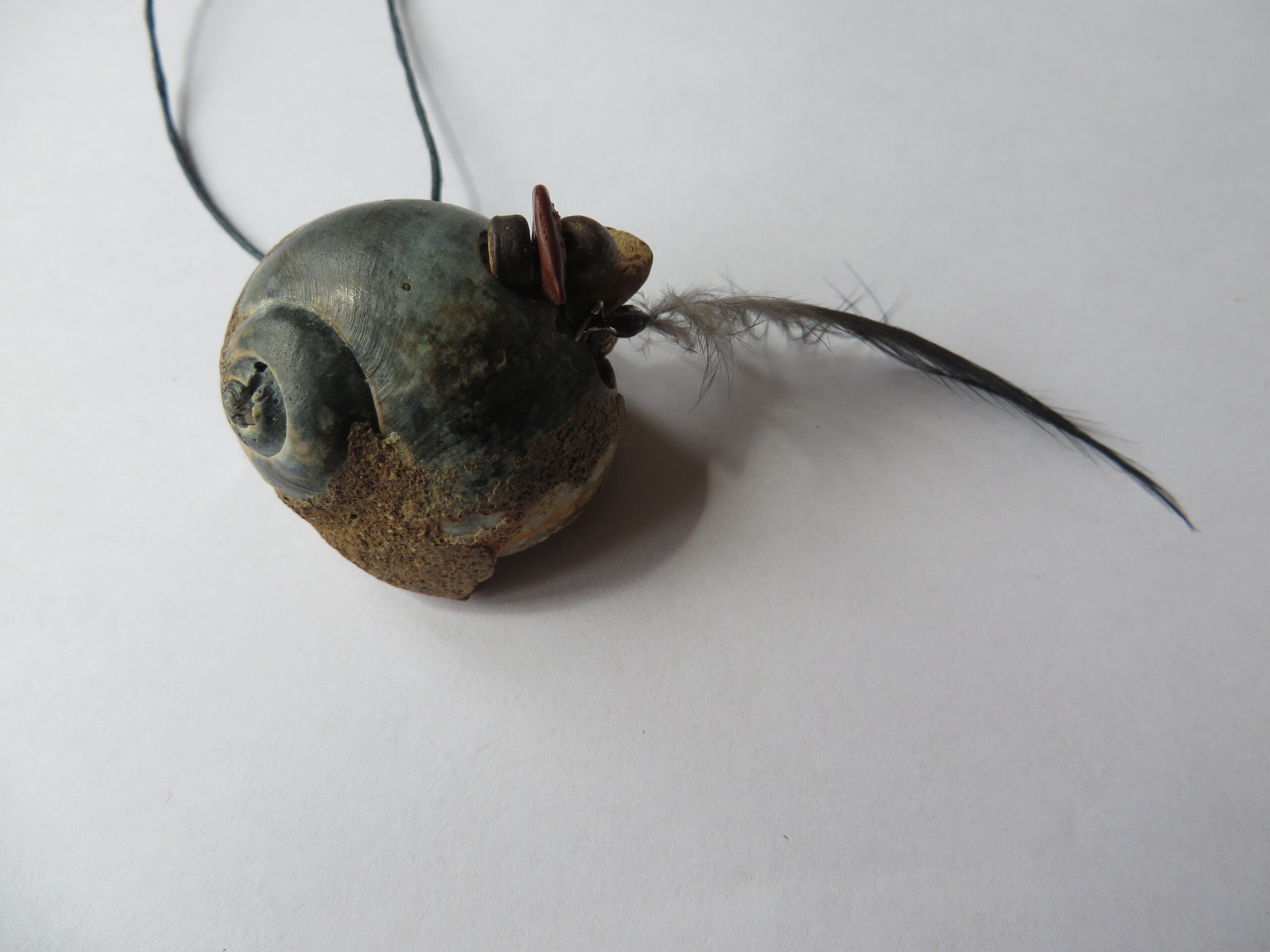 Hanger bestaand uit slakkenschelp, miniralen, kralen en veer, inclusief koordketting.