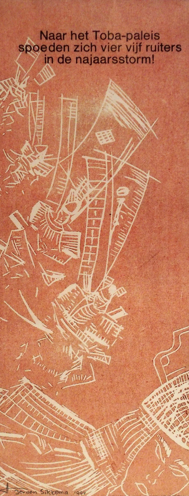 Naar het Toba-paleis spoeden zich vier, vijf ruiters in de najaarsstorm! - letters in loodzetsel + linoleumsnede techniek