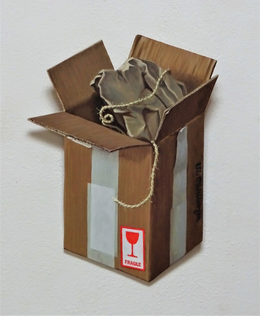 Cut~out trompe l´oeil van een pakket met 'fragile' sticker.