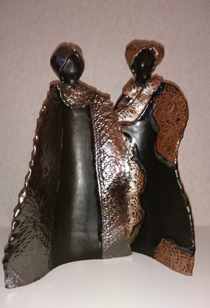 Twee dansende vrouwen die losstaan maar wel verbonden zijn. Ze kunnen op verschillende manieren geplaatst worden. Ze zijn gedecoreerd met kantafdrukken in de klei dit is met afwijkende glazuur gedaan, zilver- en bronskleurig.