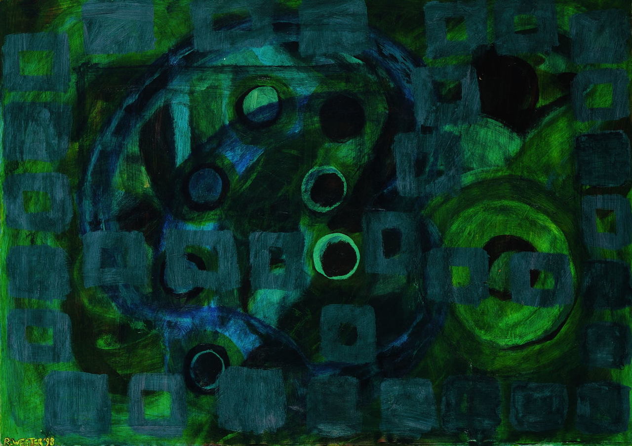 mijn schilderijen zijn gesitueerd in de stedelijke agglomeratie,met Nederland als achterliggende kracht.de overdaad aan mogelijkheden,vergezichten,architectuur en sferen probeer ik samen te vatten.deze stedelijke explosie breng ik in kaart door middel van abstracte landschappen,die ik een mystieke gelaagdheid geef als ware dat alles wat zich hier manifesteert op aarde een blauwdruk is van boven.