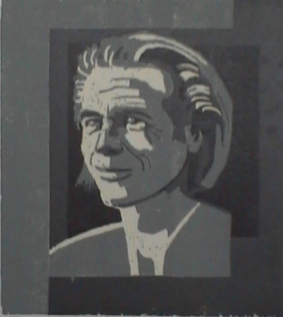 Oliedruk van houtsnede naar eigen portret, december 2000.