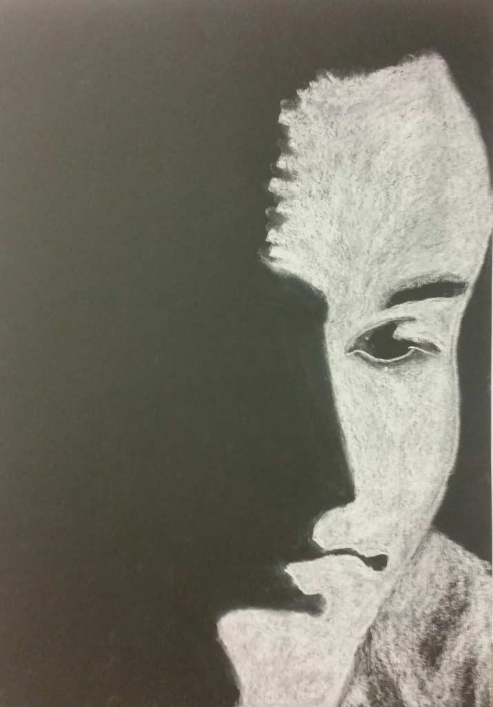 Wit pastel op zwart papier, een impressie van een jongens gezicht, december 2018.