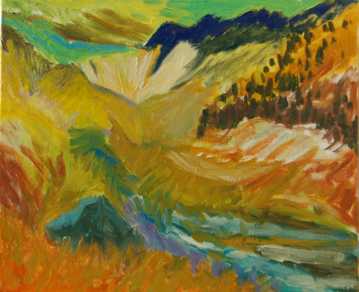 Sophie Bekkering toont in haar schilderijen en keramiek de grootse natuur. Begonnen vanuit wandelingen door de Gelderse bossen is ze inmiddels de bomen nagereisd tot aan en over de boomgrens. De ongerepte alpine ruimte waarin bomen, rotsen en water figureren.is haar speelveld.In haar schilderijen verbeeldt ze de onderliggende krachten van deze stille omgeving door middel van haar expressieve toetsen en levendige kleurcontrasten.