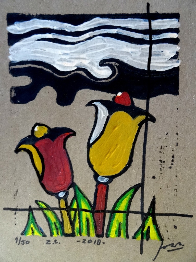 zelfontworpen tulpen linodruk en acrylbeschildering