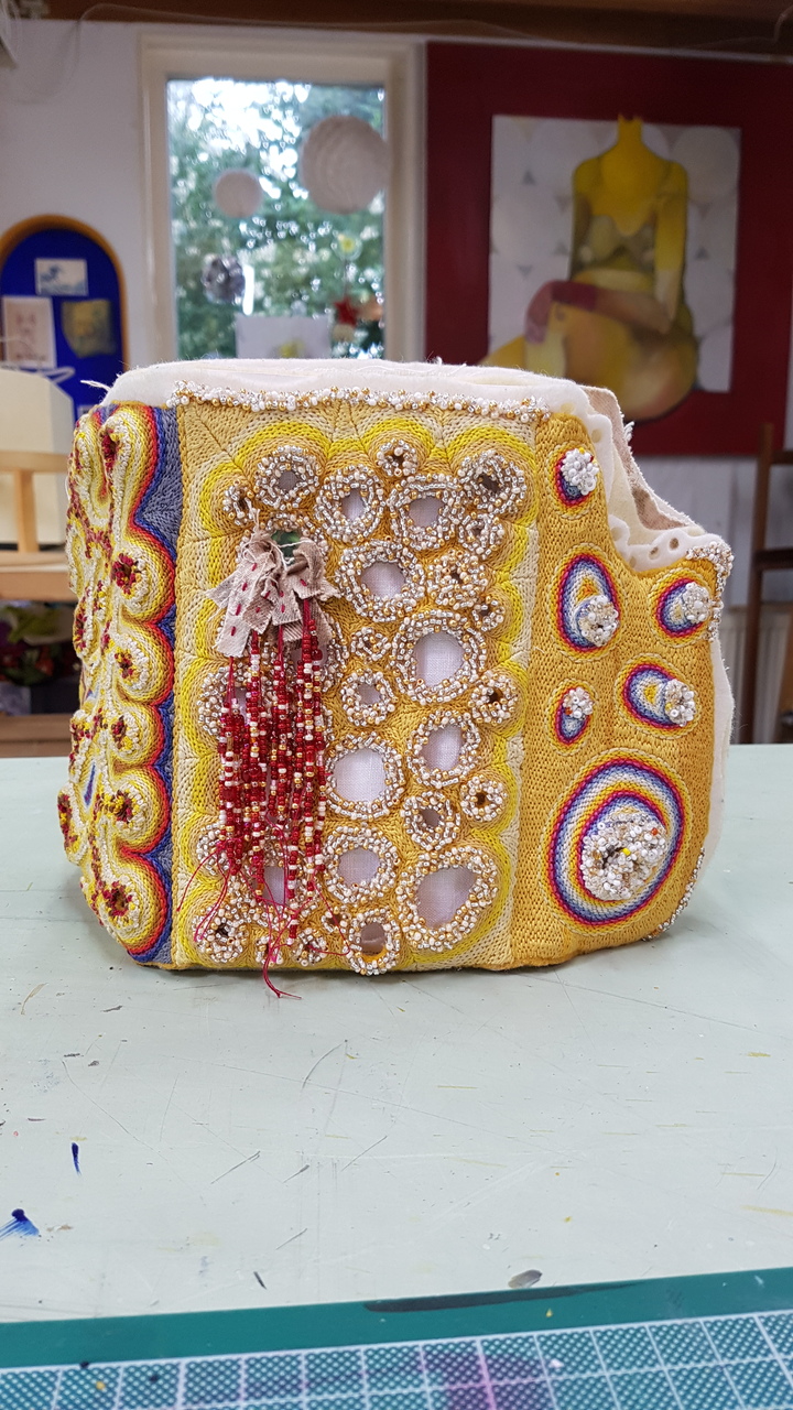 Het beschermen van je diepste geheimen. Wat de buitenwereld niet mag zien. Handgeborduurd en geweven op vilt. Met kralen.