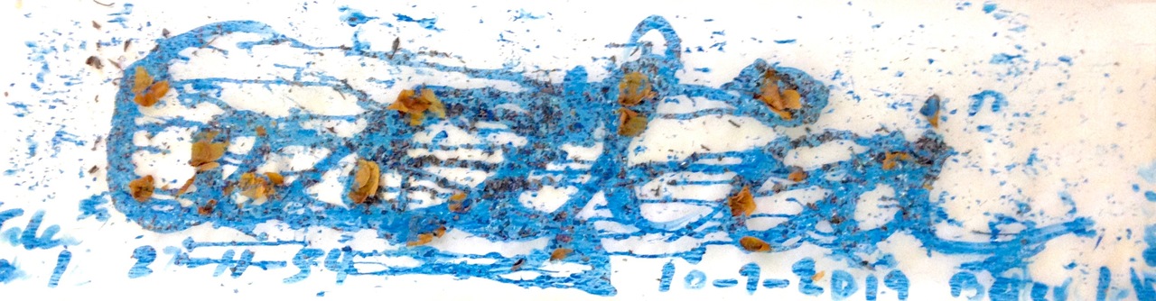 Transparant papier, acrylverf, tekst en gedroogde bloemen