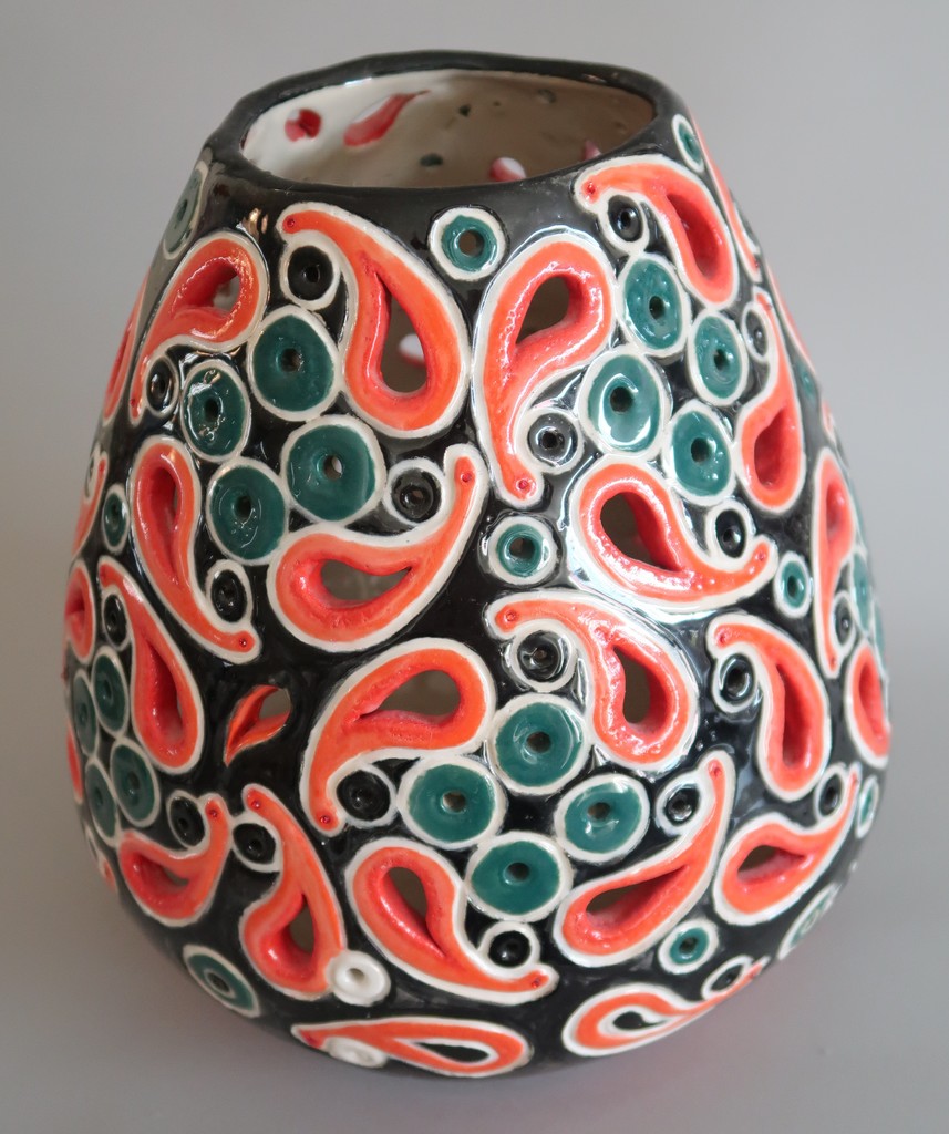 Ik ben In 2008 gestart met een keramiekcursus op Curaçao. Binnen 3 jaar had ik mijn eigen stijl ontwikkeld. In 2015 heb ik de draad in Nederland weer opgepikt. Mijn inspiratiebron stamt af uit mijn jeugd; we hadden veel kunst van geperforeerd houtsnijwerk in huis. Ik haal ook veel inspiratie uit de printsvan stoffen en ook van kleurencombinaties daarvan. Ik werk met vaste kleuren en vaak ook gedeeltelijk geglazuurd. Mijn werk heeft 2 functies: windlicht en kunstobject!