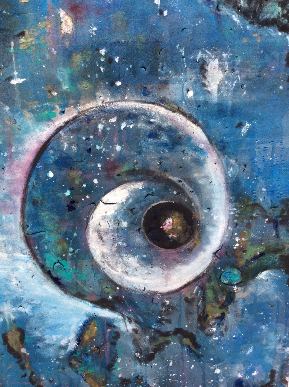 Blauw schuimplastic van twee centimeter dik op plaat triplex geplakt. Daarin met mes gekerft gekerfd en daarna acrylverf en pastelkrijt aangebracht.