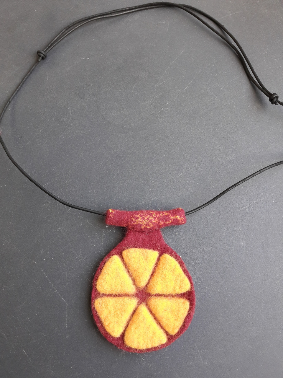 Een ketting met een gevilte medaillon met rood en geel aan een leren koordje en die je eenvoudig op de gewenste lengte kan maken.