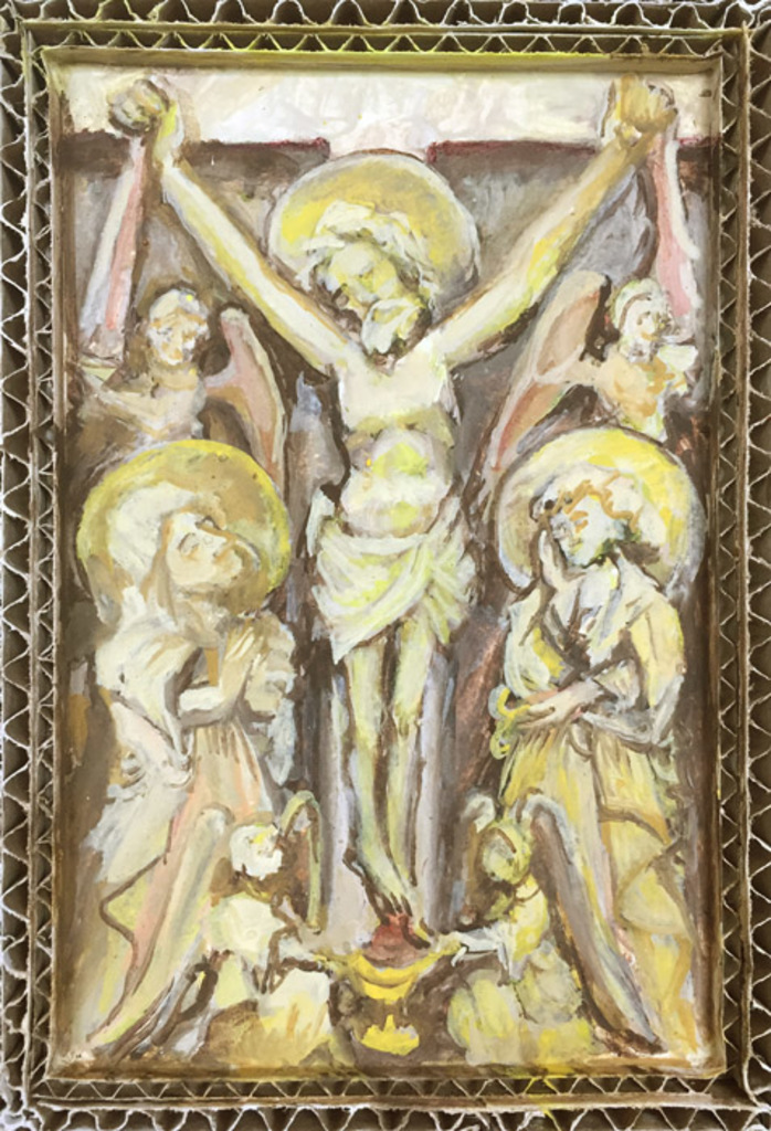 Vrij naar albasten sculptuur "Christus aan het kruis tussen Maria en Johannes" 1370-1430. Anoniem