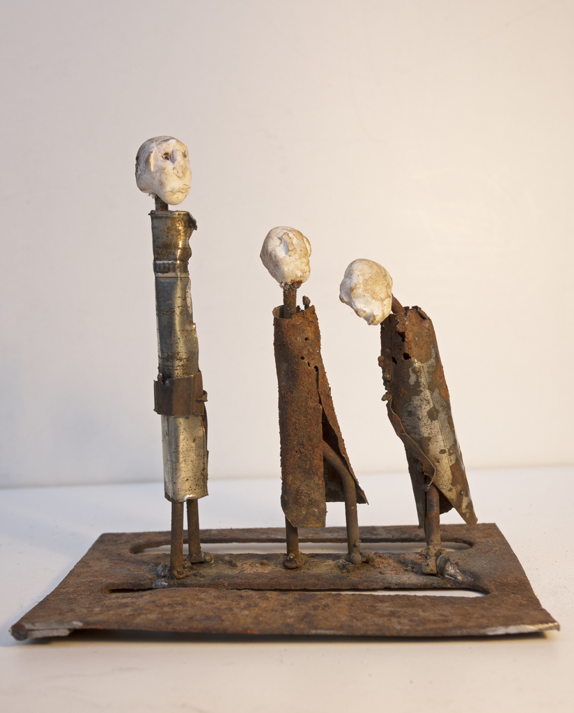 drie figuren met hoofden van niet gebakkenen luchtdrogende kneedmassa dus niet bestand tegen water