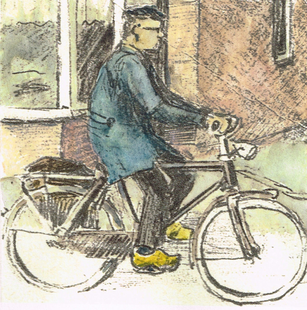 Fietsenmaker op de fiets, oorspronkelijk potloodtekeningetje, vergroot en ingekleurd.