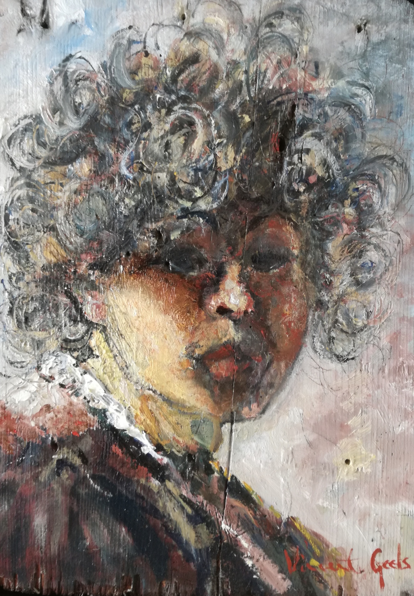 Zelf portret Rembrandt bladvulling op oud houten paneel.