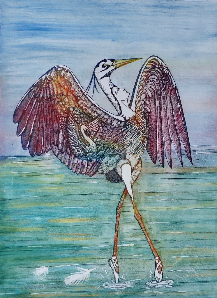 oplage 10 stuks. Dit is knipoog naar het zwanenmeer die reiger kan zo bij het ballet vandaar ook de ballerina’s. De veren zijn meegedrukt en geven zo een mooie afdruk in het water.