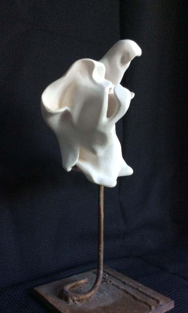 Een plak klei vouwen en indeuken en uitstulpen totdat de intrigerende vorm is ontstaan die lijkt te zweven. Het lijkt te fladderen op een stalen steel.