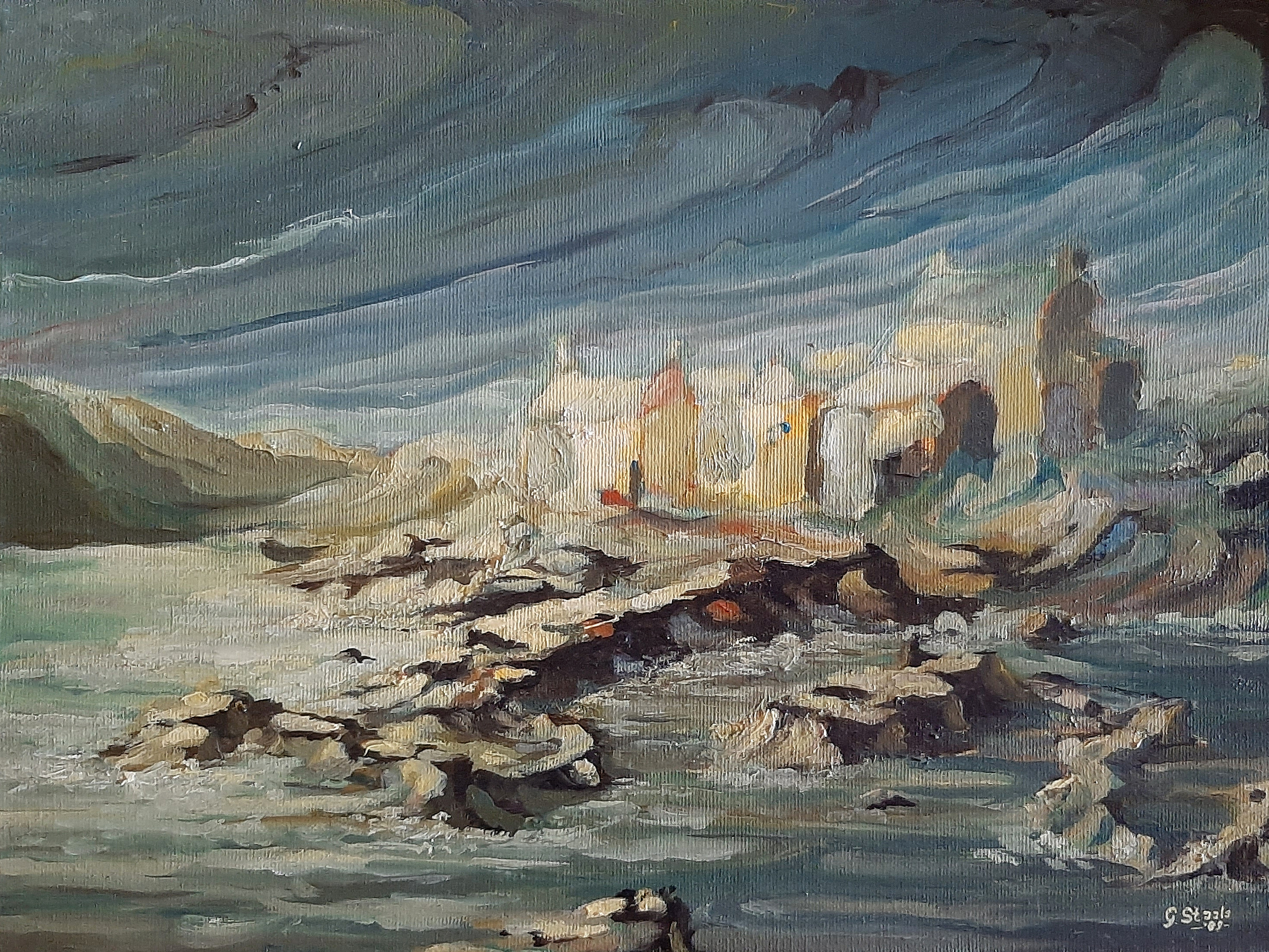 Ik heb dit schilderij pas in 2019 teruggevonden, in een krat op zolder. Het schilderij dateert uit 1989. In de jaren '80 van de vorige eeuw huurden we bijna jaarlijks een huis aan de kust van het schiereiland Quiberon (Frankrijk). Ter plekke maakt ik potlood- of houtskooltekeningen. Thuis schilderde ik dan de impressies op doek. De geschilderde plek moet ergens aan de kust op Quiberon terug te vinden zijn.