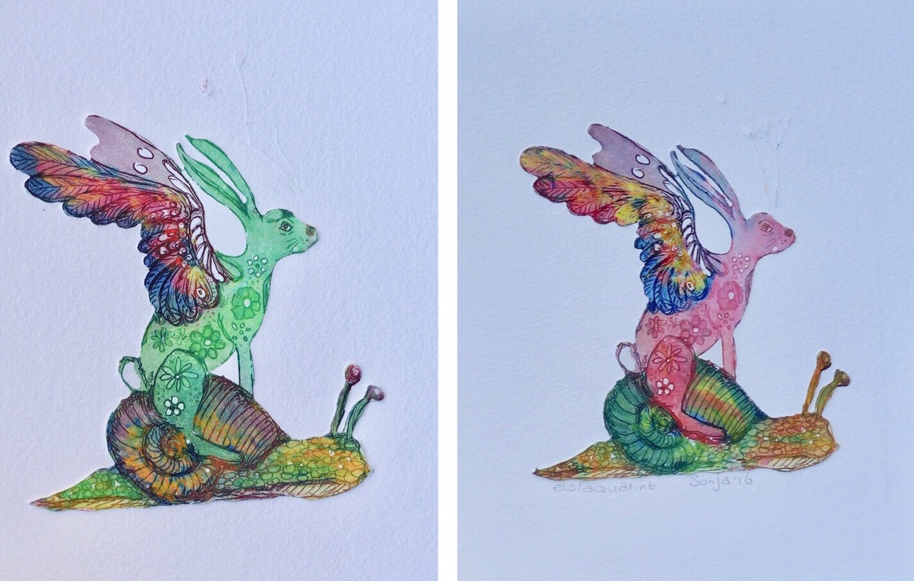 Haas en slak Dit is een ets die ik met passe-partout 18x24 cm verkoop in een geschenkverpakking. Door mijn manier van werken is iedere ets anders van kleur.