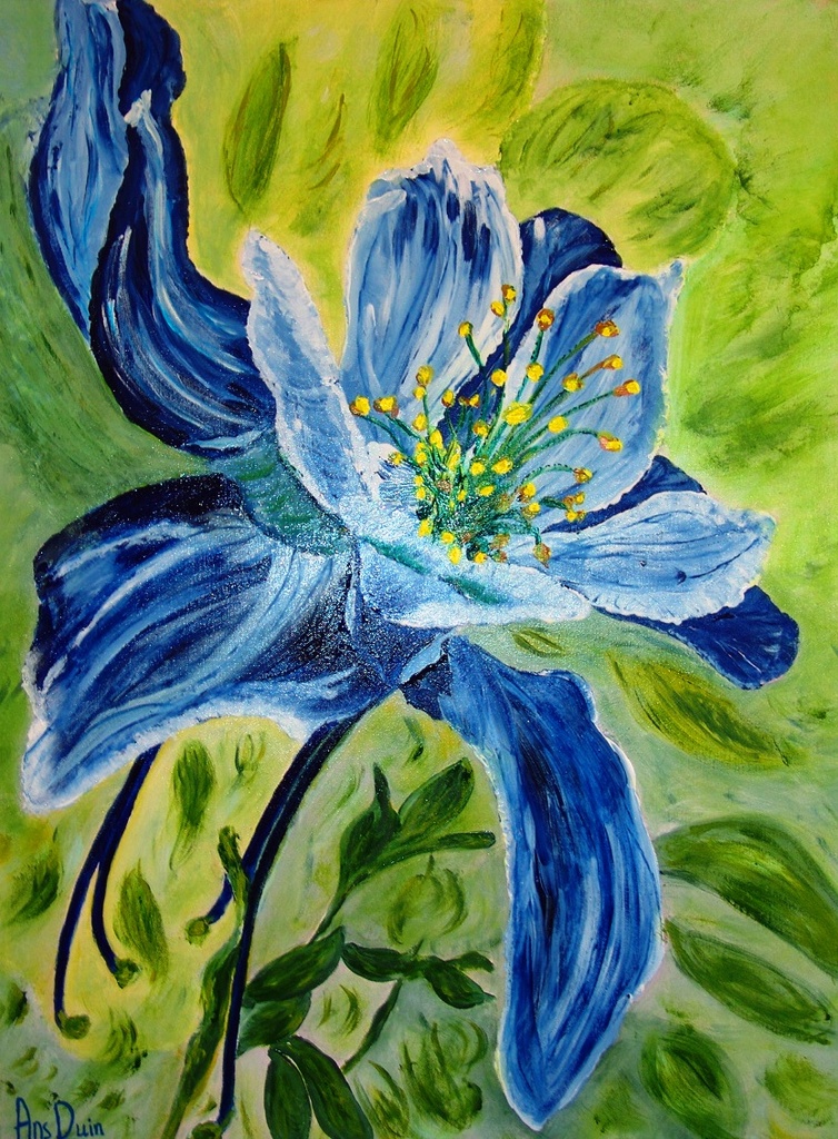 Title: Blue-white Columbine.Acrylic on cotton, painted pasty and finished with varnish.Sides painted in 1 color, so can be hung without frame. Size 80 cm. height x 60 cm. width x 4 cm. depth. Want to see for real? KbG