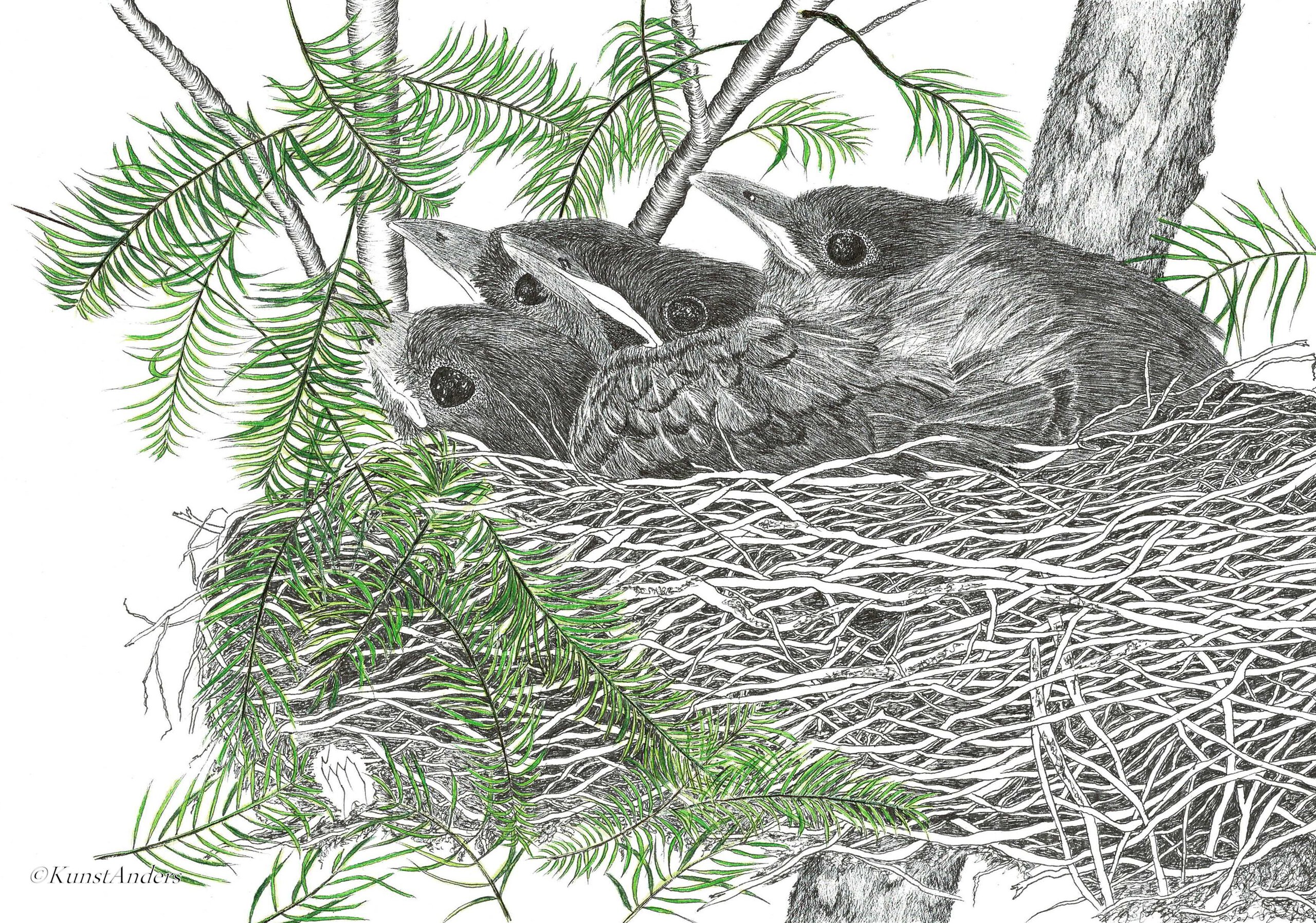 En dit cadeautje trof ik aan in de taxus vlak voor ons keukenraam. Ik was net op tijd om dit prachtige tafereeltje te kunnen waarnemen, de volgende dag waren ze gevlogen...... Origineel verkocht, nog wel beschikbaar als reproductie (beperkte oplage)
