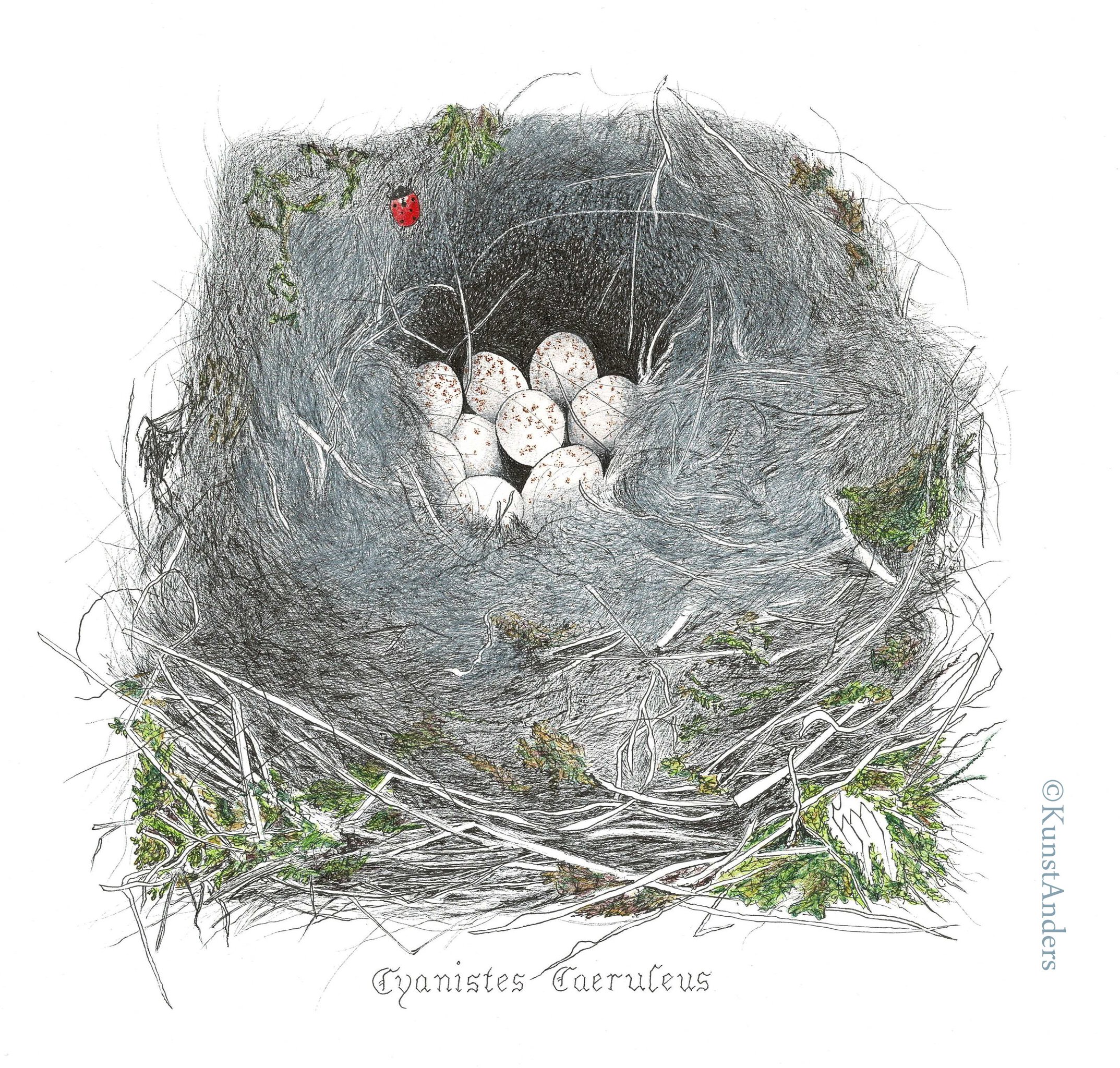 En alweer liet iemand mij weten dat hij een (verlaten) nestje had gevonden. Veel mensen weten dat ik hier altijd veel belangstelling voor heb. Zo zonde dat de eitjes er zelfs nog in zaten, maar ik was er wel blij mee. Zo prachtig om te tekenen: een nestje van een pimpel met de eitjes er nog in, zo leven ze toch nog voort....