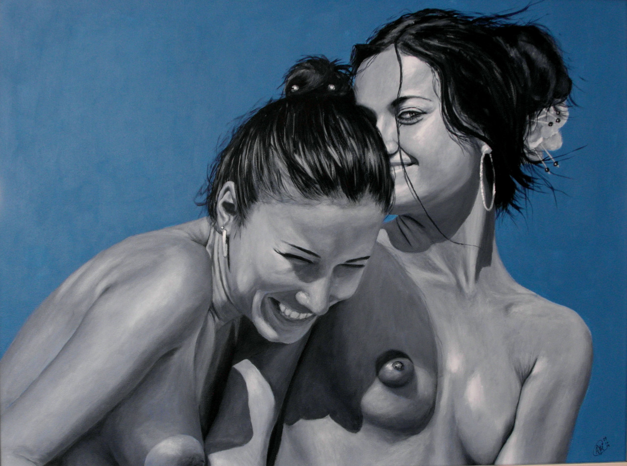 Realistisch Wit Meisje Zwart Vrouw Portret Naakt Ondeugend Lachen Humor Dubbelportret Duo