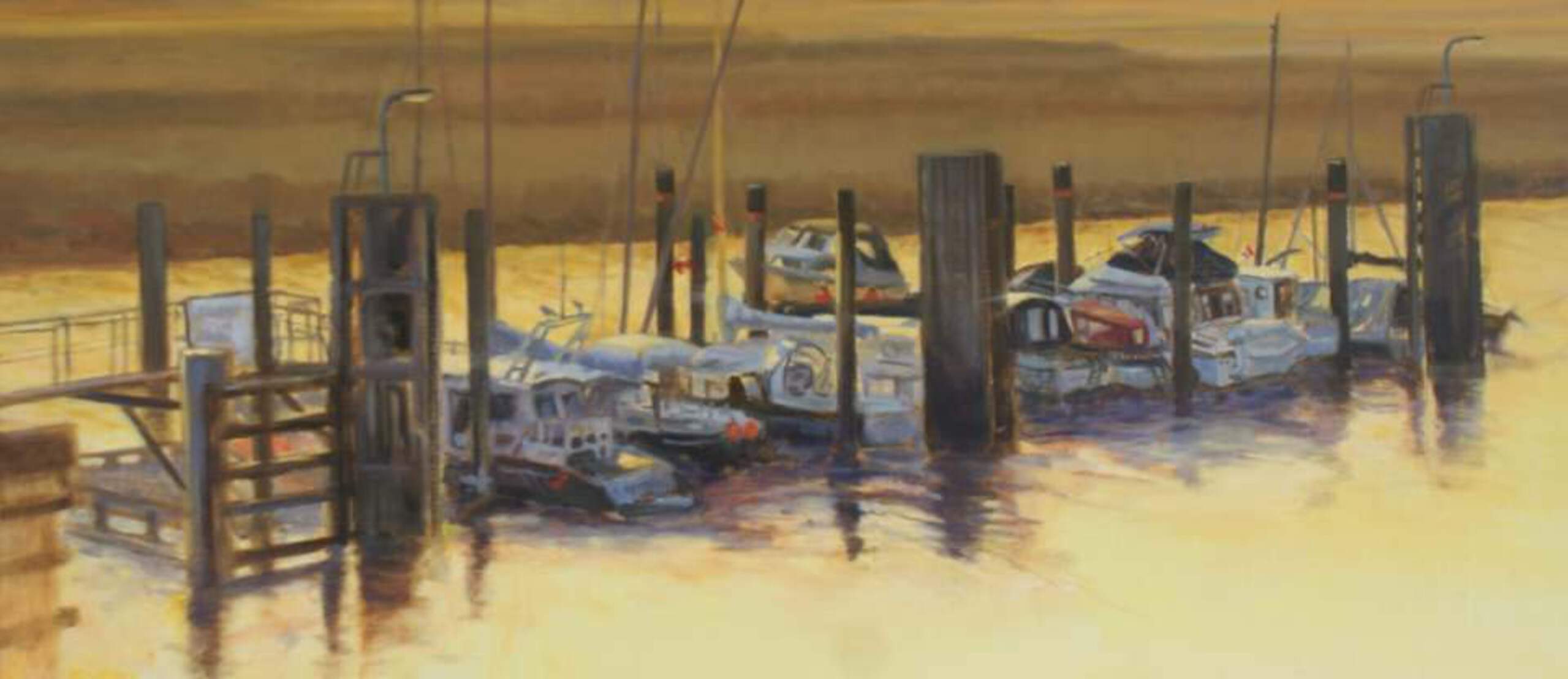 Coming home, Boten bij Nieuw Statenzijl, olieverf op linnen, 45 x 90. (verkocht)