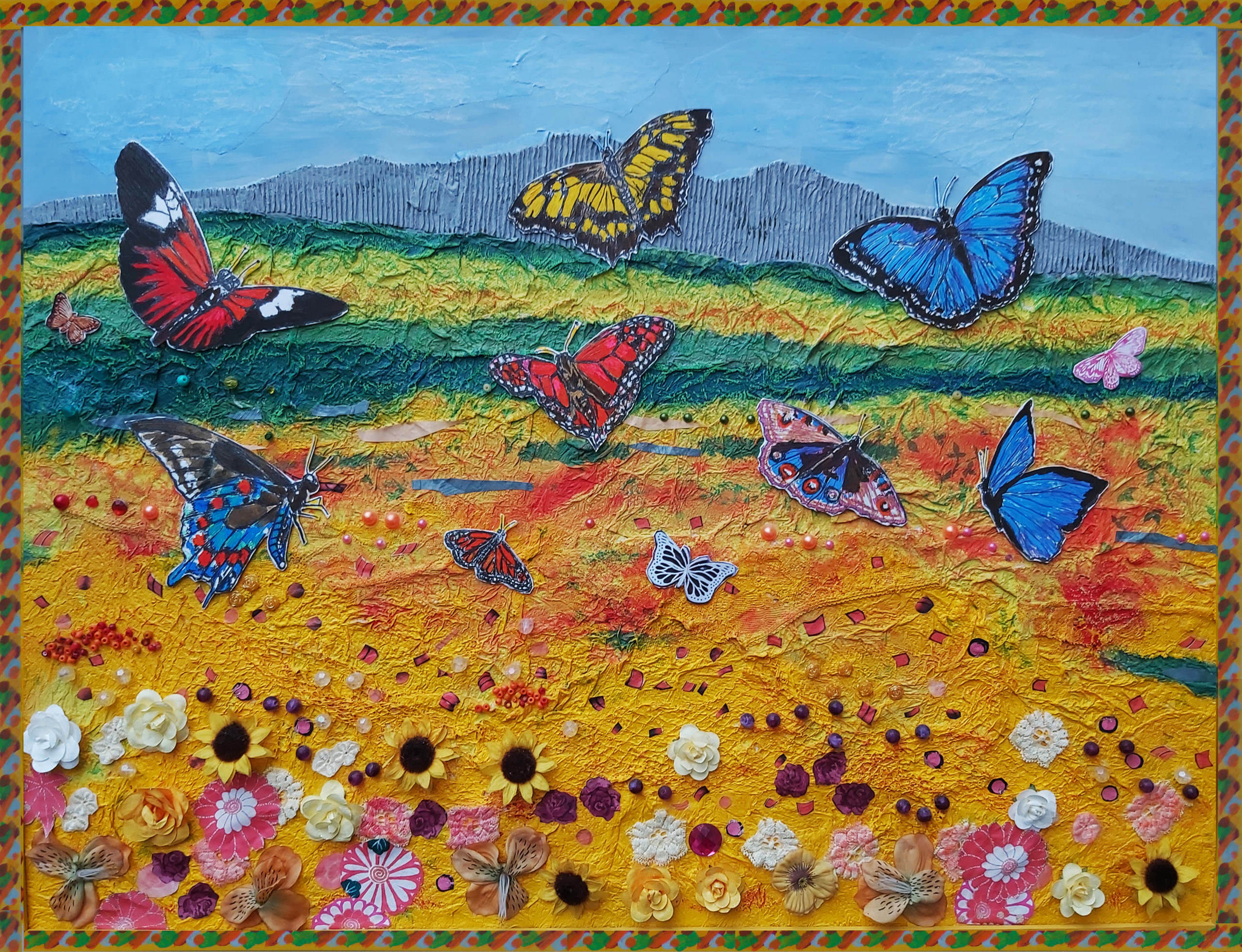 Fantasielandschap met gele bloemen en vlinders die heerlijk vrij in de lucht vliegen. Het werkstuk is een acrylschilderij en collage met diverse materialen. Houten lijst met decoratie.