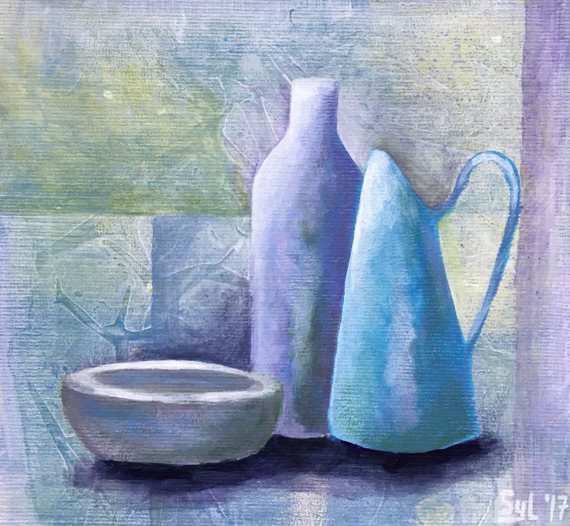 Acryl Paars Schaal Stilleven Flessen