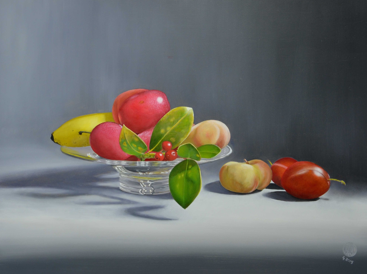 Glazen schaal met fruit: banaan, pruimen en wilde perzik. Olieverf op paneel 40 x 30 cm. april 2015.