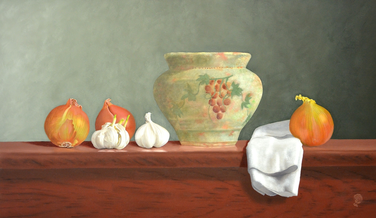 Druivenpot met uien en knoflook. Olieverf op paneel 60 x 35 cm. juli 2019.