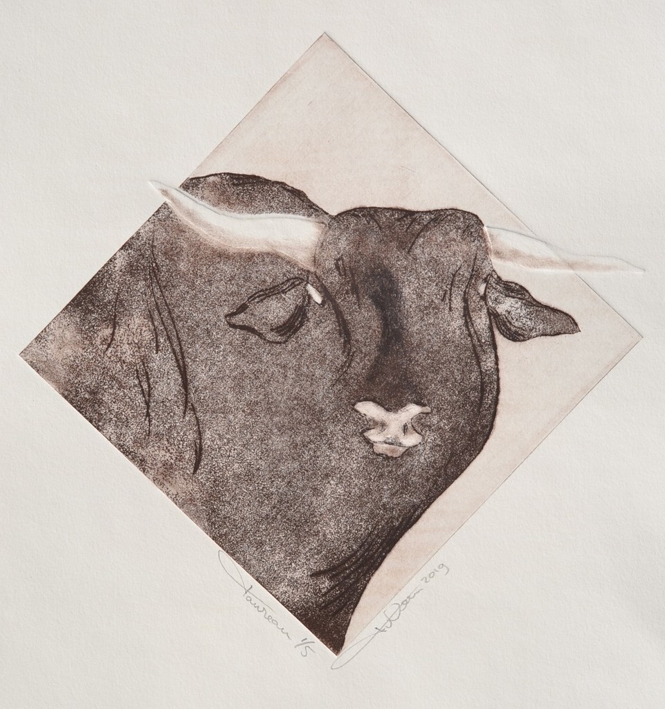 Stier / Taureau - droge naald en aquatint - uitgezaagde zinkplaat - meerkleuren druk - oplage 1/5