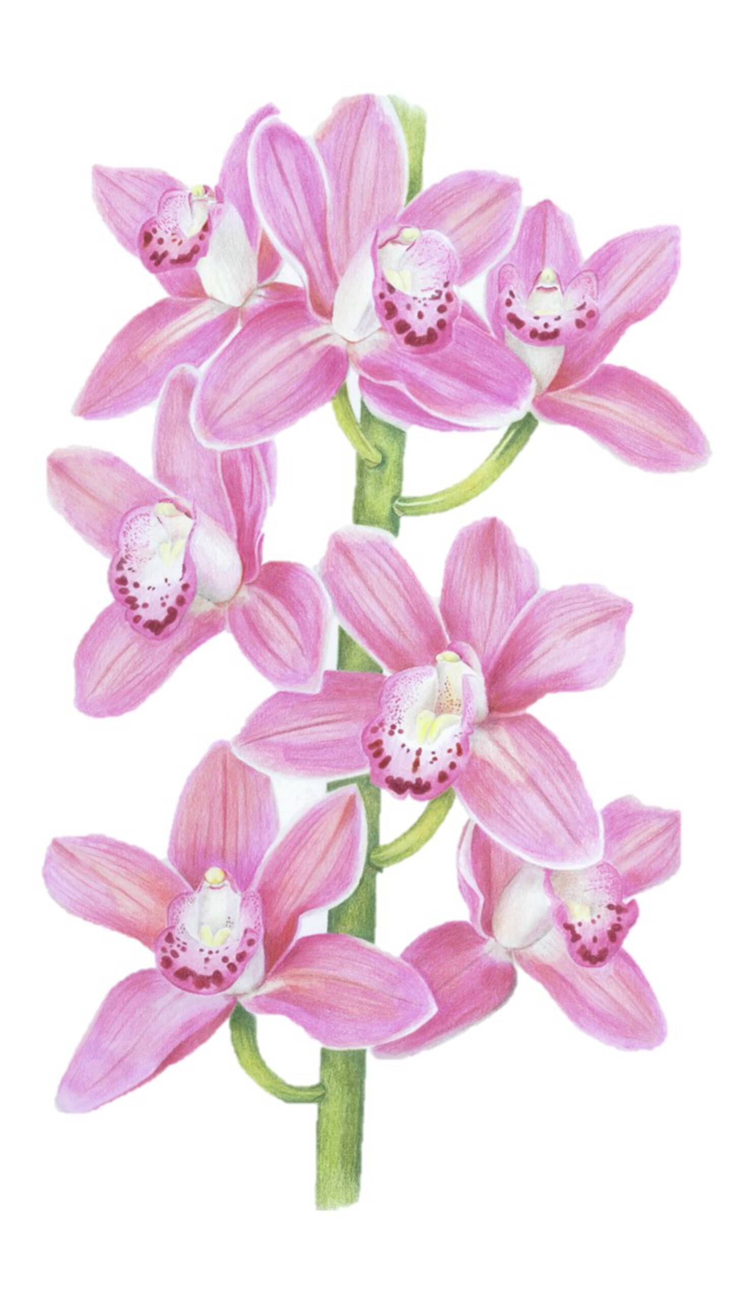 Tekening gemaakt met alcoholmarkers en kleurpotlood. Deel van een tak van een cymbidium orchideee