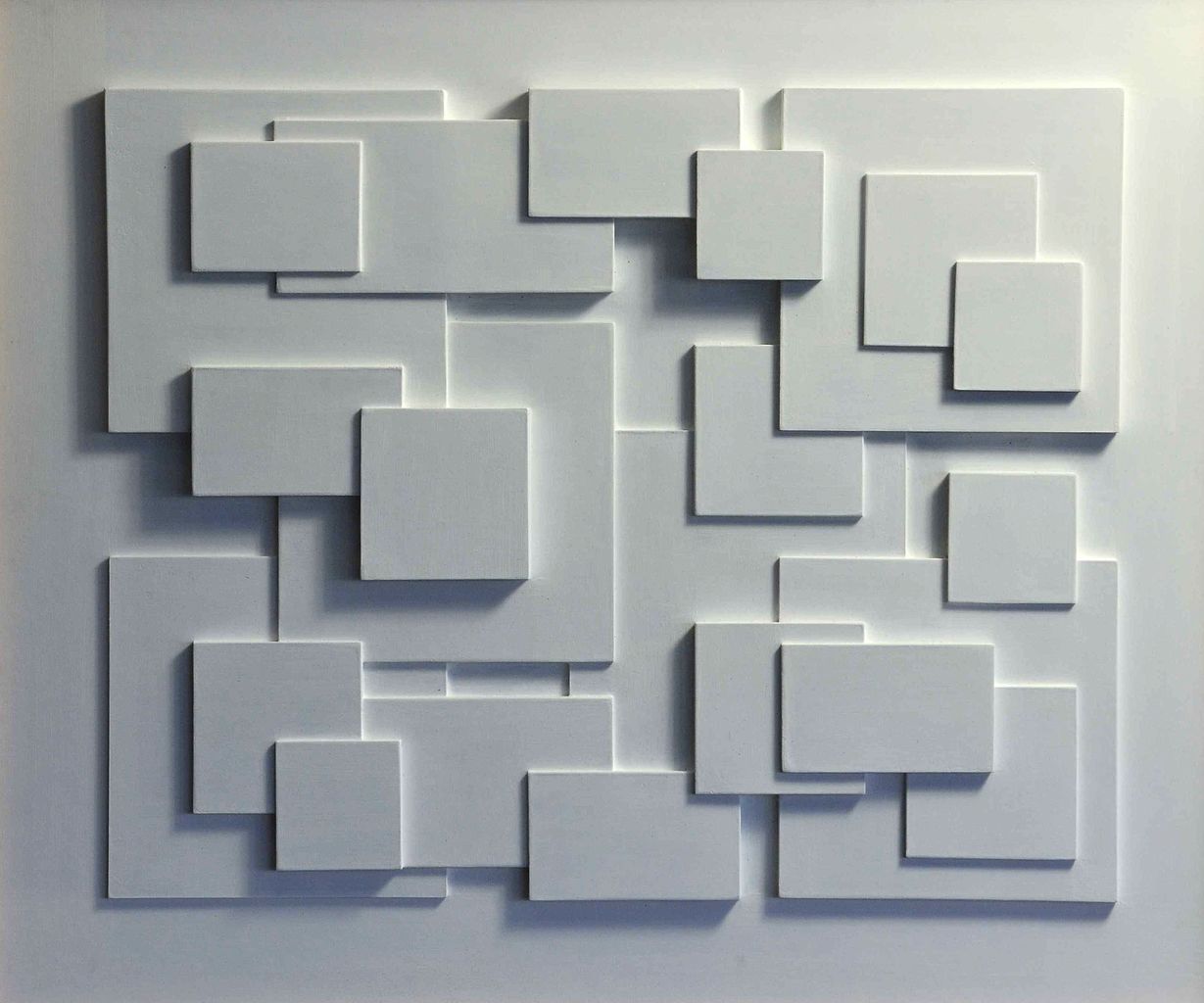 Reliëf, gestapeld hardboard. Uitvoering: witte acrylverf.
