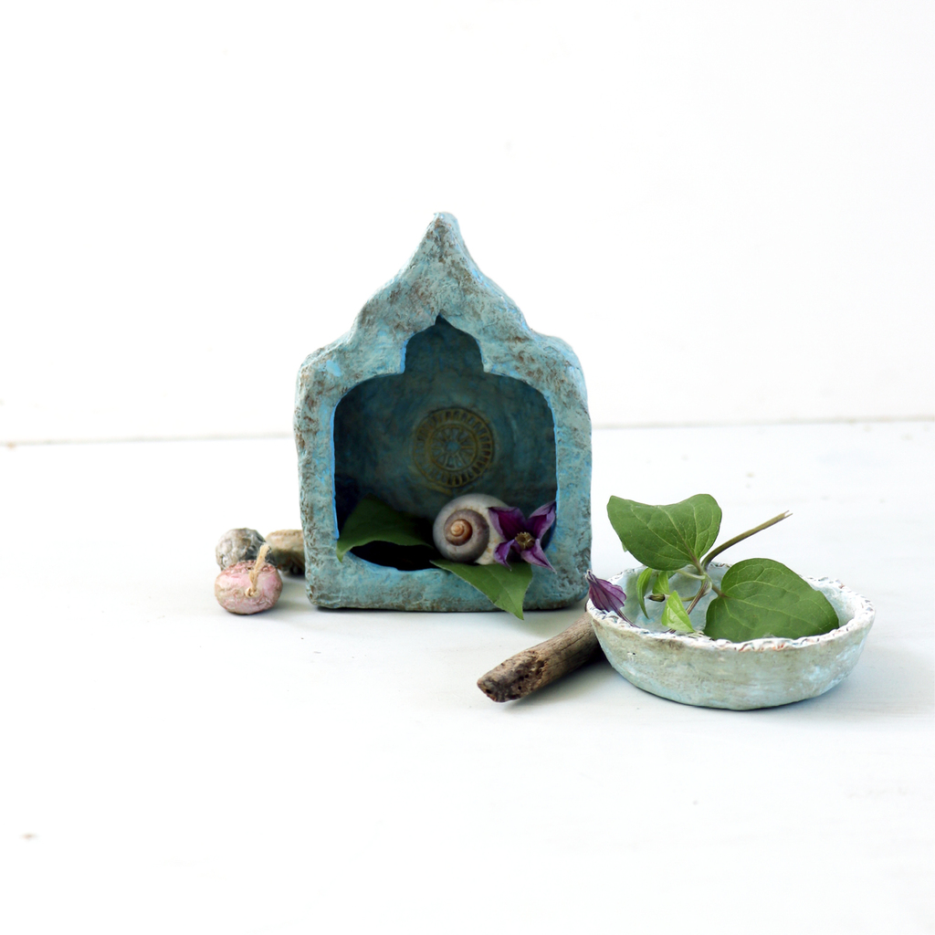 Dit kleine handgemaakte altaarkastje van papier mache vormt straks een bijzonder en klein plaatsje op je bureau of dat lege plekje aan je muur. Het is een kleine plek om te herinneren, te koesteren en gerust te stellen. Ik heb dit kleine altaartje ontworpen als reis-altaar. Het is klein genoeg om mee te nemen in je koffer én erg licht van gewicht. Maar het ziet er natuurlijk ook geweldig uit op je bureau of op een leeg plekje op je boekenplank. Dit eerste Journey of Heart altaarkastje heeft een geweldige textuur en is beschilderd in warme kleuren. Aan de binnenzijde is een klein rond ornament aangebracht. Kan staand en hangend gebruikt worden.