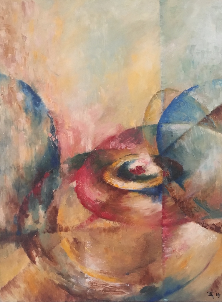 Heerlijk om een gevoel met een eigen draai aan de werkelijkheid op een abstraherende wijze op het doek te zetten.