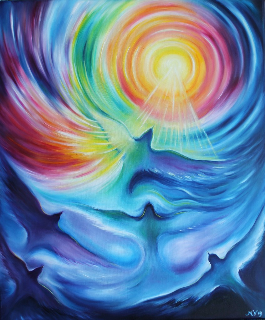 Een intuïtief schilderij dat gaat over ons als mens en ziel, net als vogels, vliegend of reizend door het leven naar de zon of het licht; wat symbool staat voor eenwording. De verschillende kleuren van het leven en het licht waar we doorheen gaan en de verschillende lagen van het leven aan emoties en levenservaringen die ons vormen.