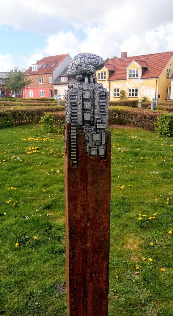 Met electronische systemen geintegreerde menselijke hersenen als a symbool van de toekomstige integratie van mens en machine ( en onze run naar een technological singularity. Het moment dat de machine slimmer is als wij) Deze keer geen werk met een stekker maar een 'traditionele' sculptuur van giet aluminium en staal.