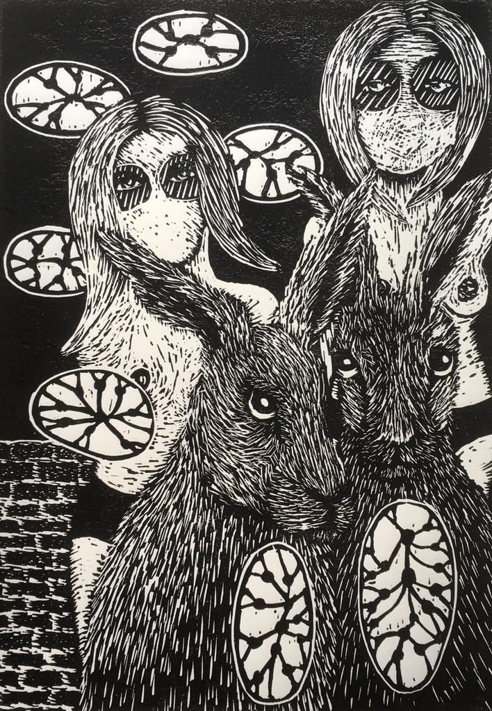 Linosnede Prent Zwart Wit Hazen Vrouwen Portret