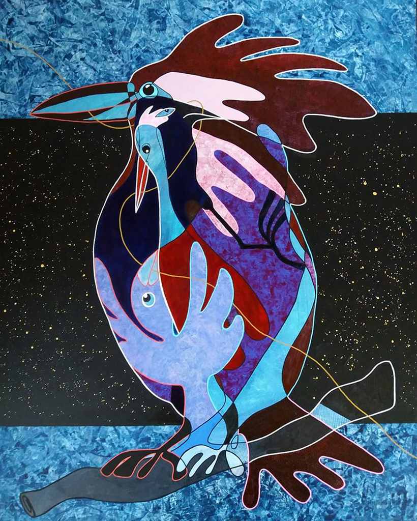 Ieder mens heeft subpersoonlijkheden. Hier zie je vier types in de vorm van vogels, in één grote vogel. Het is geschilderd met acrylverf en acrylstift, maar ook getekend met kroontjespen en acrylinkt. Grote vormen, vlakken, op groot formaat doek, tegenover het fragiele en fijne kroontjespenwerk is een verrassende combinatie.