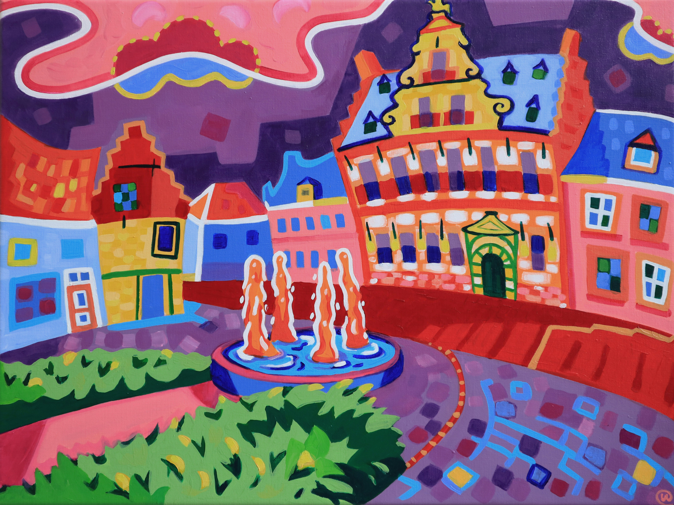 De balans in Middelburg, met de Sint Jorisdoelen (1582) en een oranje gekleurde fontein (zoals met koningsdag) * Dit werk is te leen via CBKZeeland!