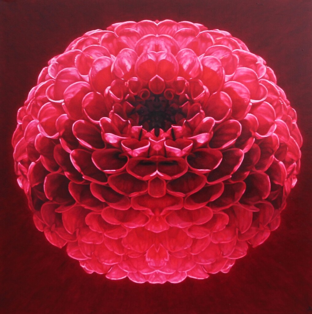 Dahlia Bloem Symmetrie Rond Planeet Rood Vuur Roze Dieprood Hyperrealisme
