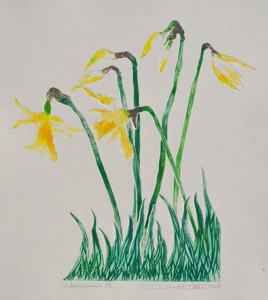 Narcissen - droge naald en aquatint - uitgezaagde zinkplaatjes - meerkleuren druk - oplage 1/5