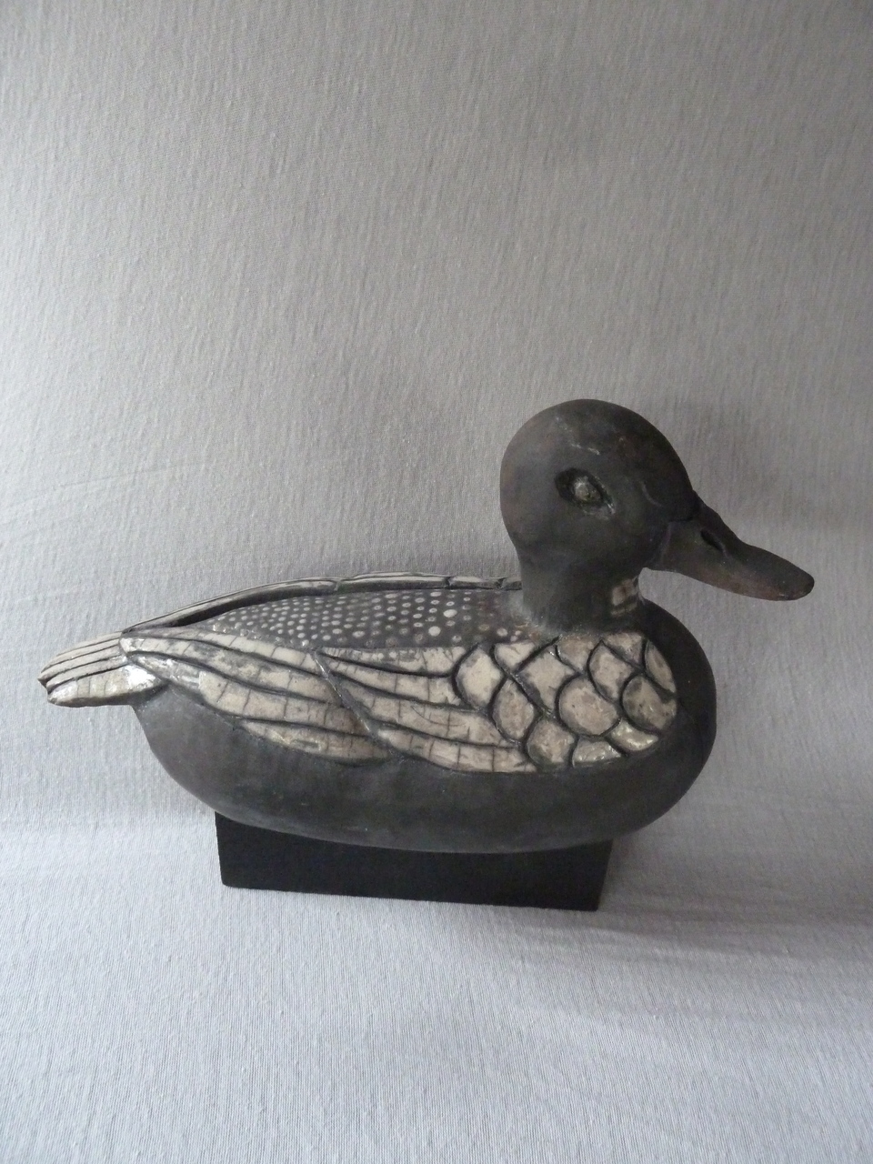 Zwart wit raku gestookt eend van keramiek op houten zwarte sokkel.