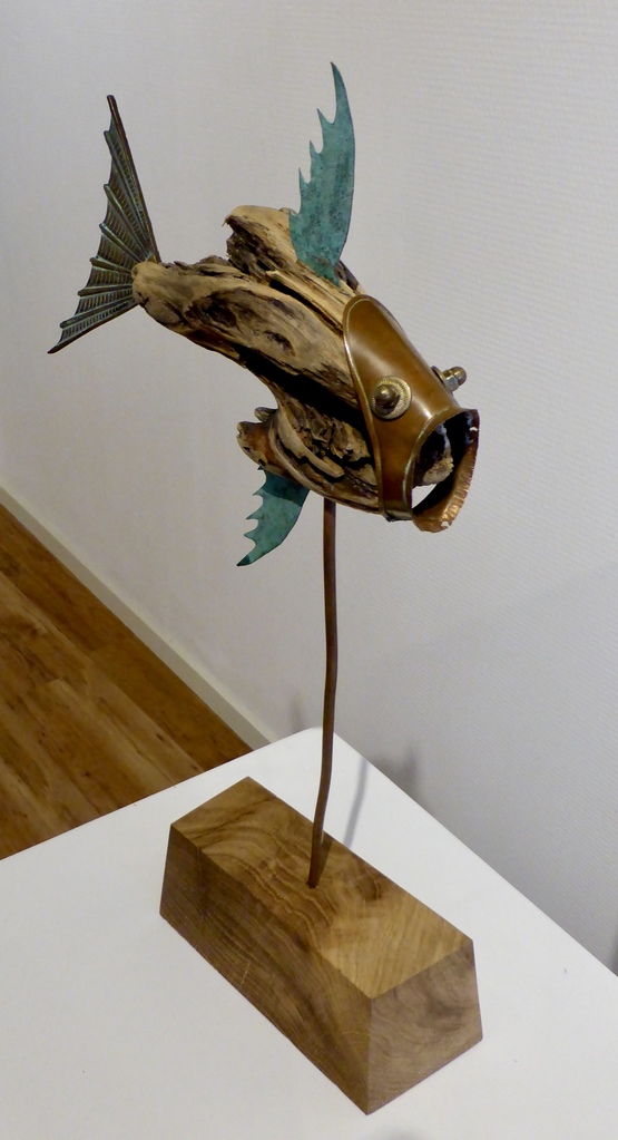 Maakt vissen. Vissen van drijfhout, wrakhout, vindhout en zaagafval. En natuurlijk oude verfblikken, koperen meuk, moertjes, knopen en alles wat verder nog onder schroot valt. En beleeft daar een kinderlijk plezier aan.