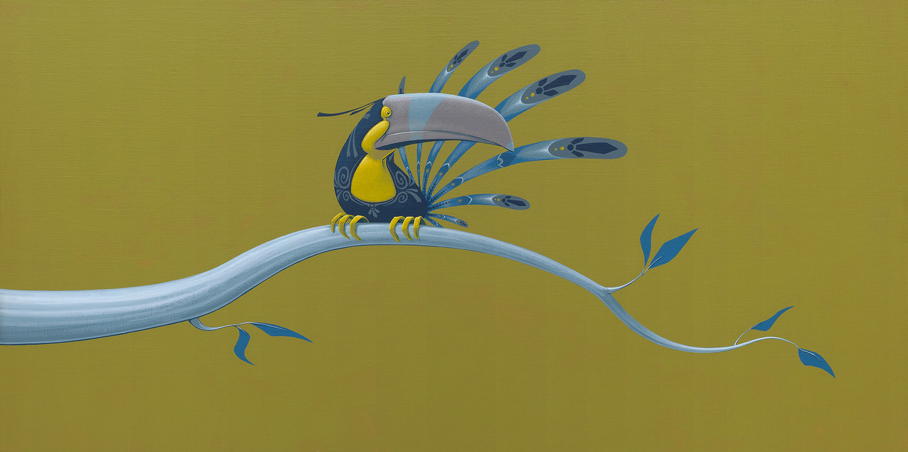 Schilderij van een fantasie toekan op een tak.