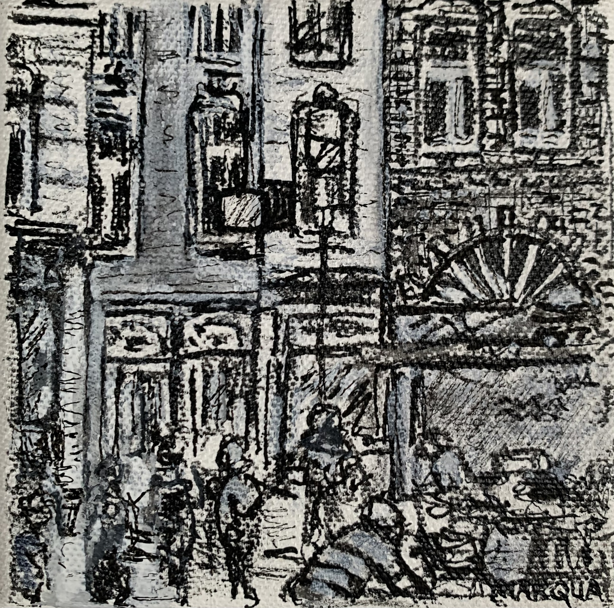 Markt/Ridderstraat in ‘s-Hertogenbosch, zwarte en paynes grey inkt op doekje 10x10 cm.