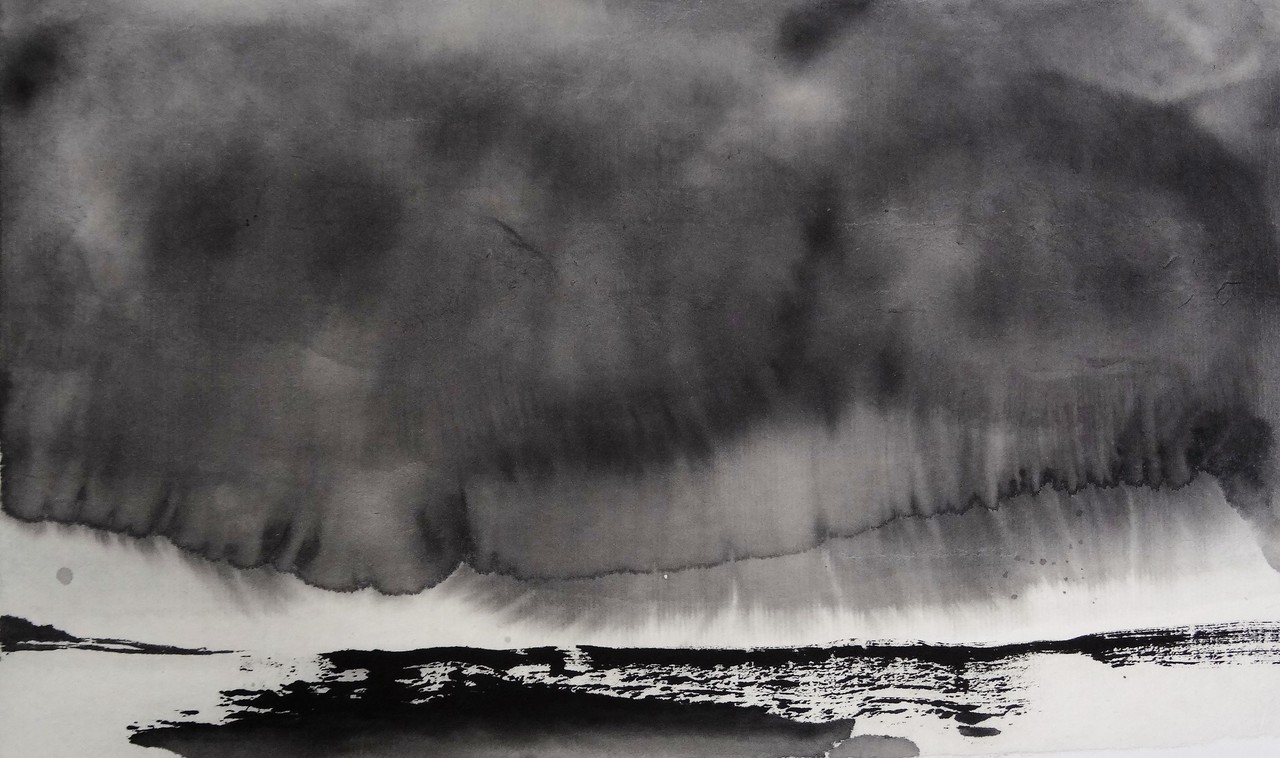 Diep zwarte wolken boven zee, inkt op rijstpapier